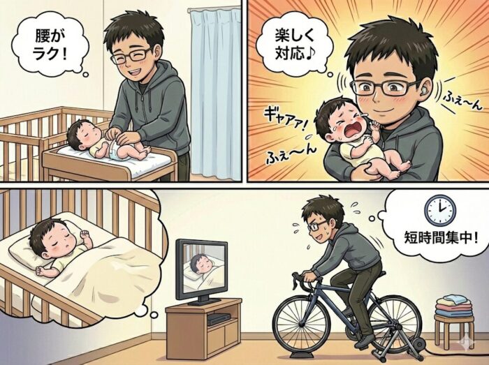 坐骨神経痛持ちのサイクリストにとって、育児中の「中腰」と「長時間の座りっぱなし」は天敵です。